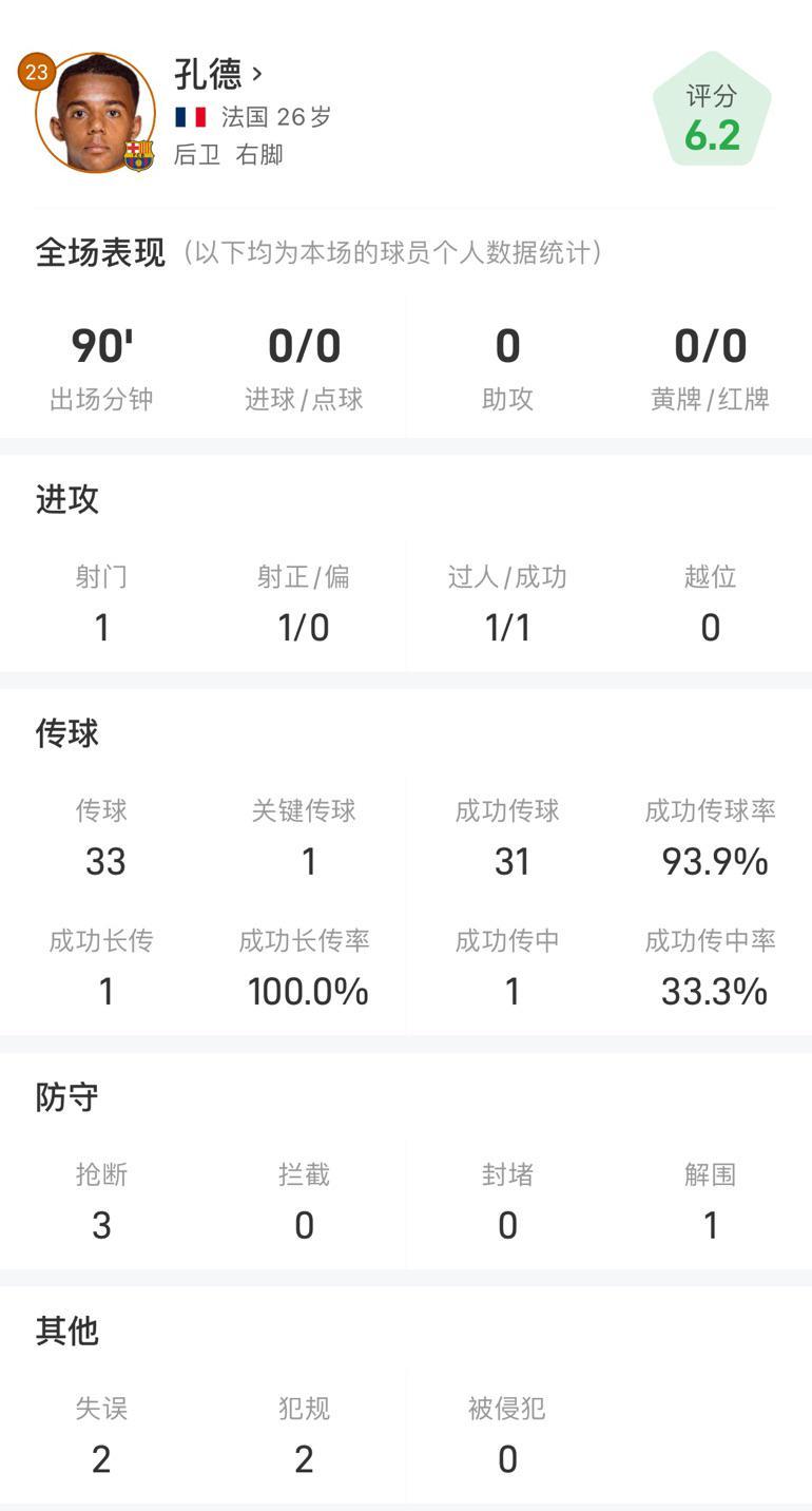在这场激烈的对抗中,孔德的数据表现成为了赛后讨论的焦点。以下是他本场比赛的详细数据统计: