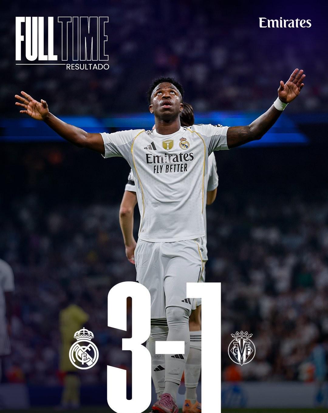 皇马3-1胜比利亚雷亚尔登顶西甲,维尼修斯姆巴佩闪耀伯纳乌