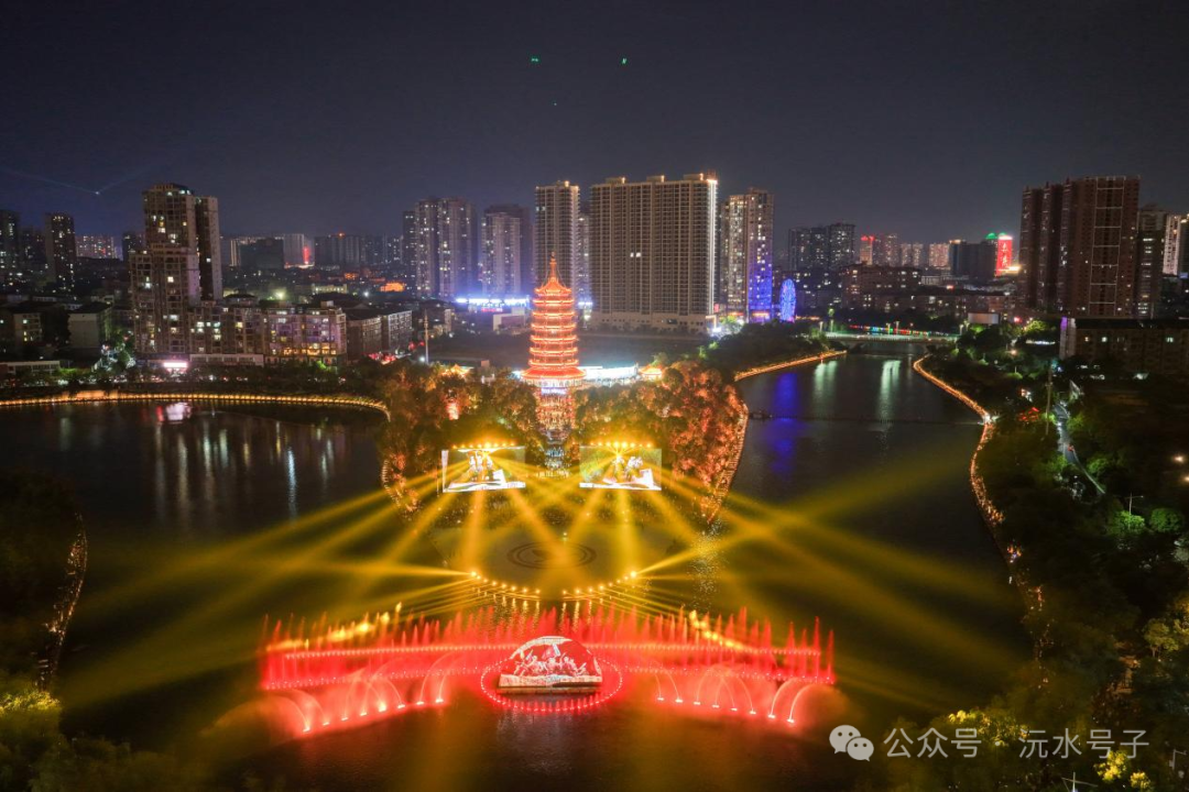 (10月3日晚,怀化市鹤城区太平溪畔的鹤鸣洲化身光影秘境。潘雨 摄)
