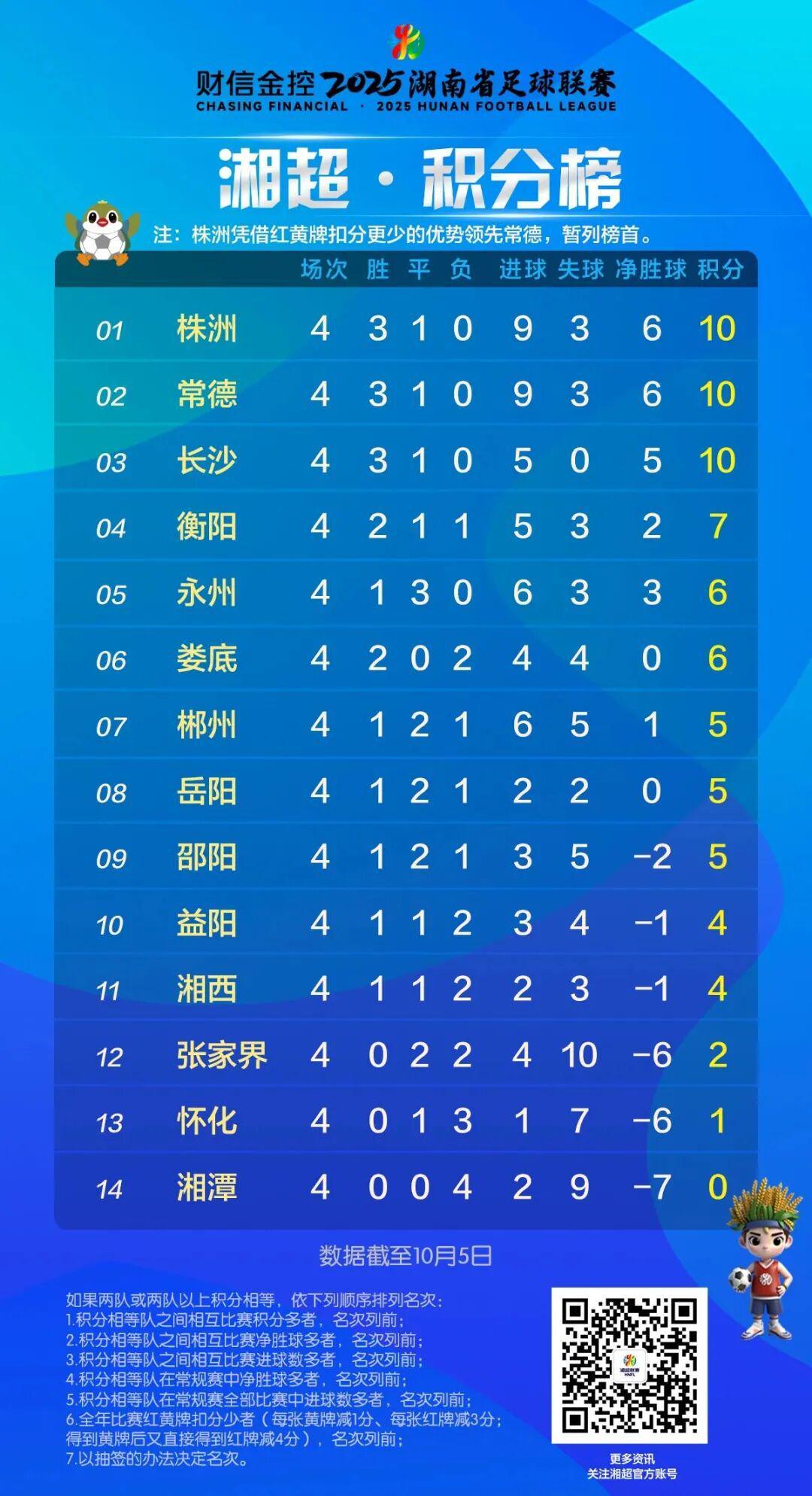 目前,株洲队在四轮比赛中取得了三胜一平的佳绩,凭借红黄牌扣分更少的优势,暂时位列积分榜榜首。