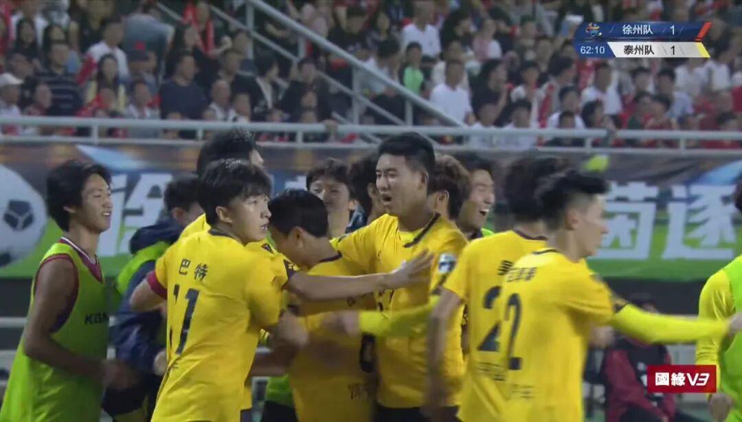 下半场易边后,泰州队迅速调整战术,发起强势反扑。比赛第62分钟,泰州队9号樊超抓住机会,用一记头球“泰山压顶”,将比分扳平,让比赛重新回到了同一起跑线。