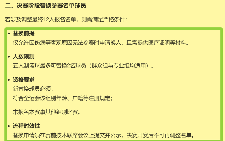 此外,若球员出现伤病无法参赛,也可进行换人。被换的球员需符合全运会该组别年龄、户籍等注册规定,且未报名过本赛事其他组别比赛。郭艾伦与张镇麟均满足这些硬性要求。