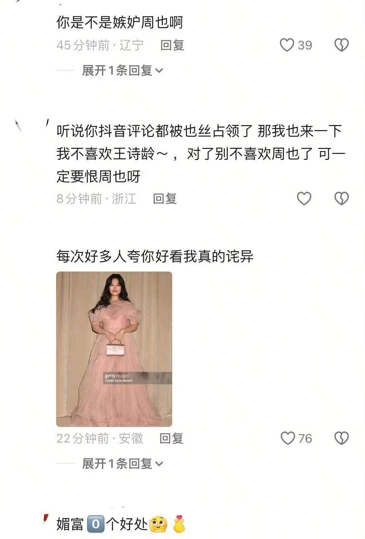 由于李湘的微博设置了评论限制,网友们便转而攻占了王诗龄的社交账号评论区。他们晒出了王诗龄参加活动时的生图照片,指责她又胖又丑,即使穿着高定也远不及周也,甚至猜测她是因为嫉妒周也才说出不喜欢的话。