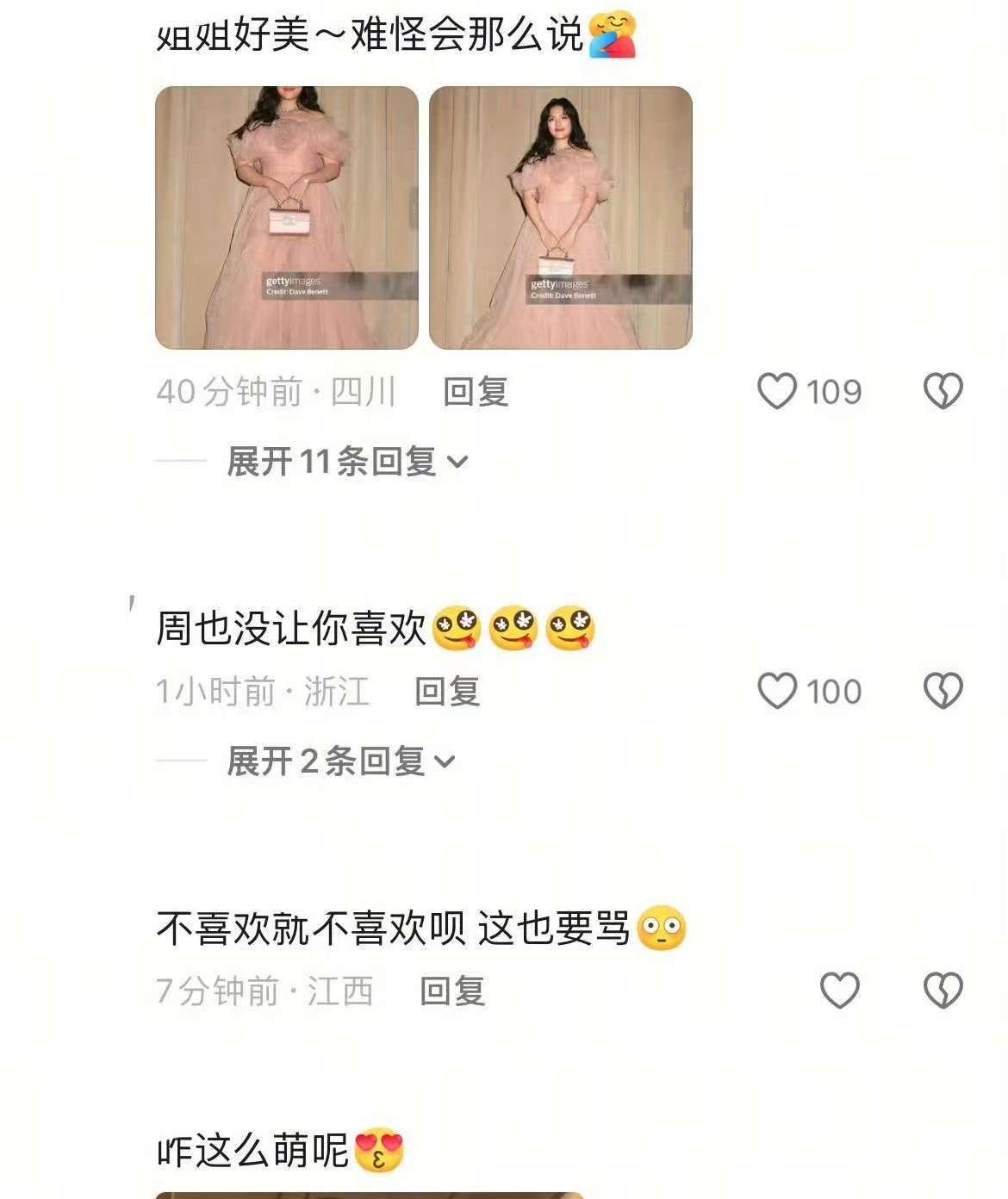 照片中,除了鲜花,还隐约录下了两个人的对话。第一个声音称赞道:“她这个妆画的不错!”而第二个声音则表示:“我不喜欢周也。”正是这句话,成为了争议的导火索。