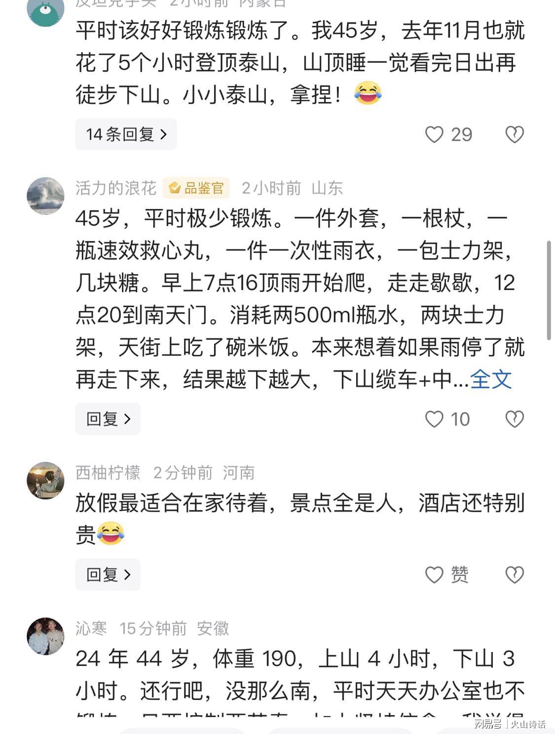另一位24年44岁、体重190的网友表示,自己上山用了4小时,下山用了3小时。他平时在办公室也不锻炼,但只要控制好节奏,加上坚持信念,他认为任何人都可以完成。