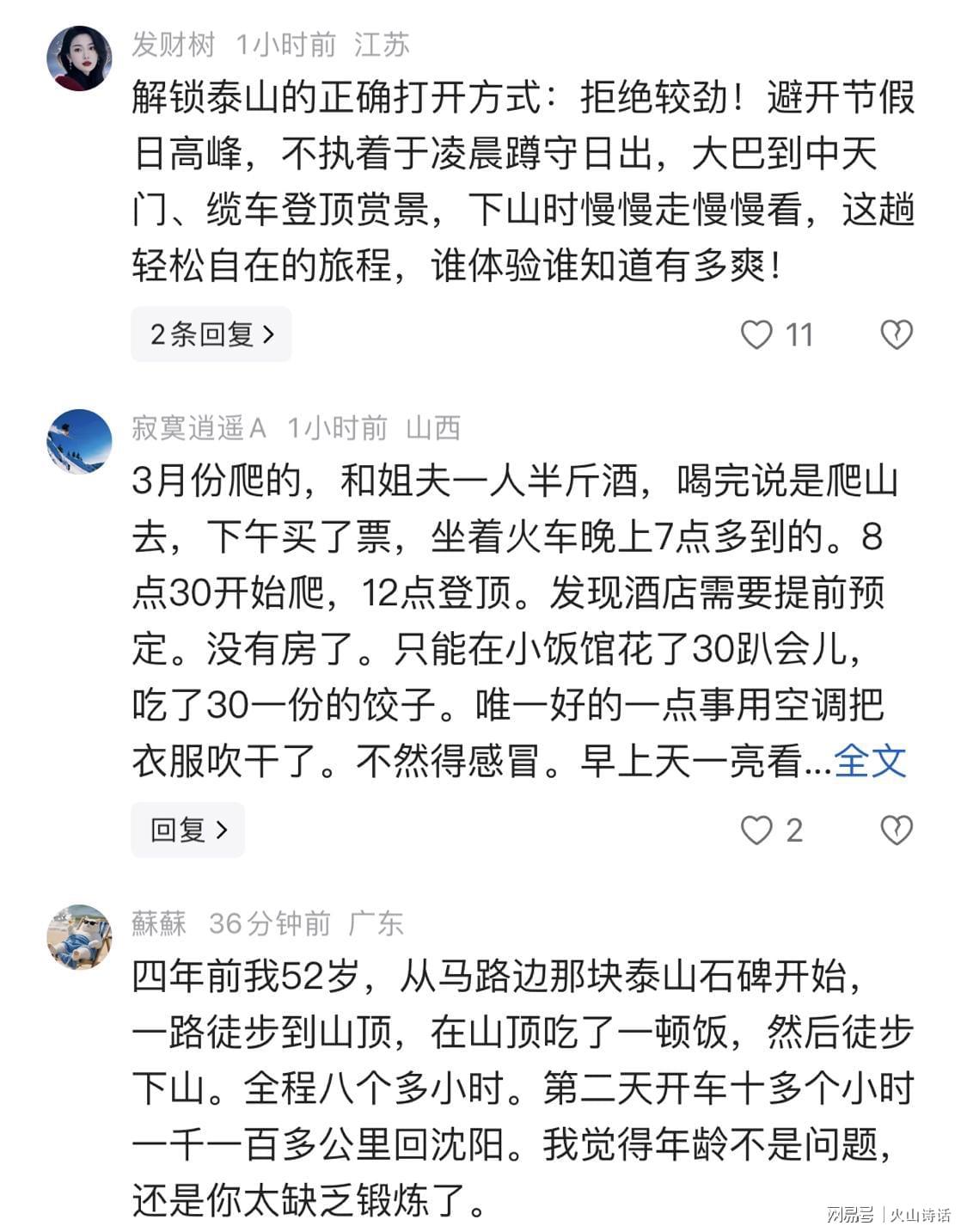 还有网友分享了解锁泰山的正确打开方式:拒绝较劲!避开节假日高峰,不执着于凌晨蹲守日出,可以选择大巴到中天门、缆车登顶赏景,下山时慢慢走慢慢看。这样的旅程轻松自在,让人倍感爽快。