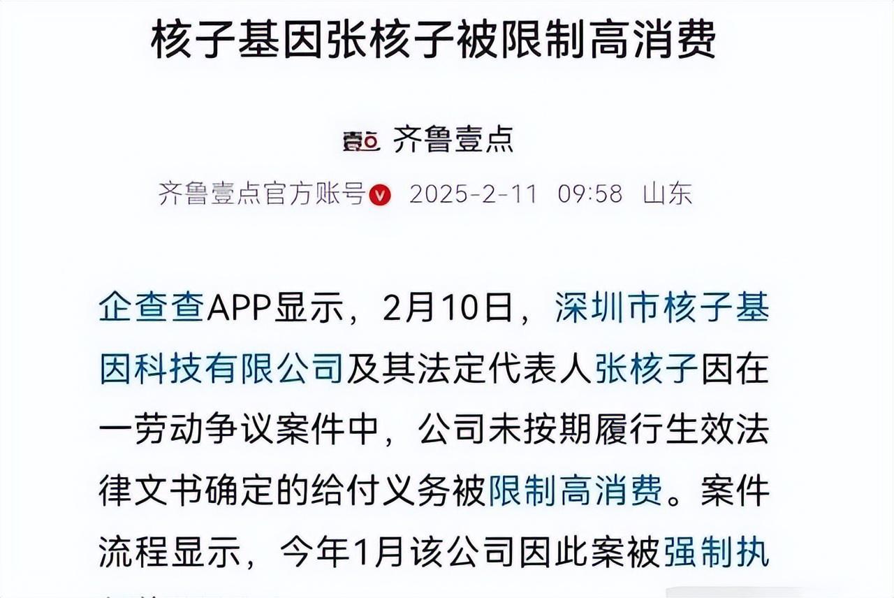 2025年危机全面爆发:1月23日因欠薪20.5万元被深圳南山区法院强制执行,2月10日遭限高令禁止头等舱、星级酒店消费,名下21家公司注销。尽管张核子试图通过高铁商务座视频自证未被限高,但法院执行信息显示其仍处于受限状态。5月起,深圳核子华曦实验室以服务合同纠纷为由,陆续起诉福建莆田、内蒙古呼伦贝尔等地卫健局追讨检测费,暴露资金链断裂危机。