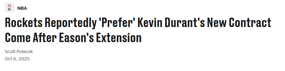 北京时间10月6日,NBA转会市场迎来一则重要消息。据知名记者Jake Fischer报道,休斯顿火箭队在续约策略上做出了重大调整——球队目前更倾向于优先与年轻前锋伊森完成续约,之后再与超级巨星杜兰特商讨续约事宜。这一决策背后,是火箭队对薪资空间和未来阵容构建的深思熟虑。