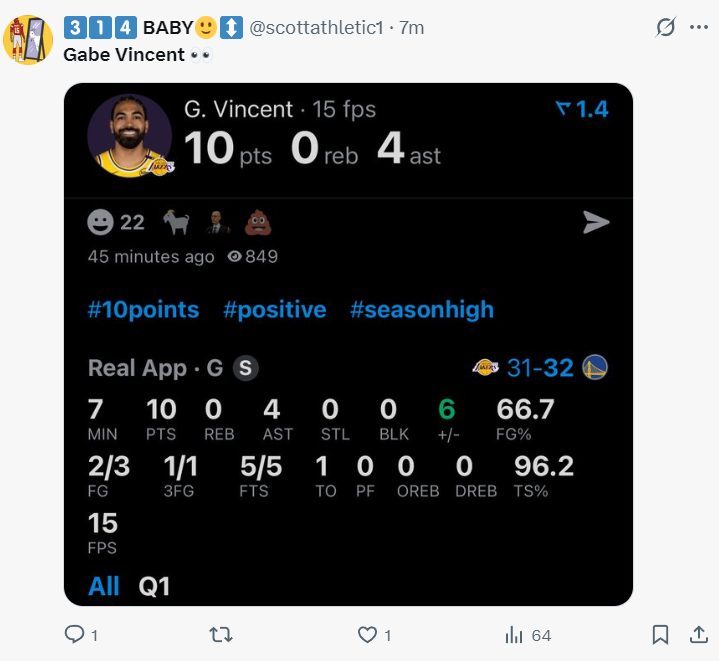 然而,文森特的下场成为比赛转折点。湖人最后三分钟进攻哑火一分未得,勇士在穆迪和希尔德的带领下完成反超。第三节湖人主力登场后毫无战意,文森特该节2投0中(三分1中0)仅送出1次助攻,湖人单节净负12分直接崩盘。最终,文森特三节打卡下班,全场19分钟内9投4中(三分7中3),得到16分5助攻2失误,命中率44.4%,三分命中率42.9%。