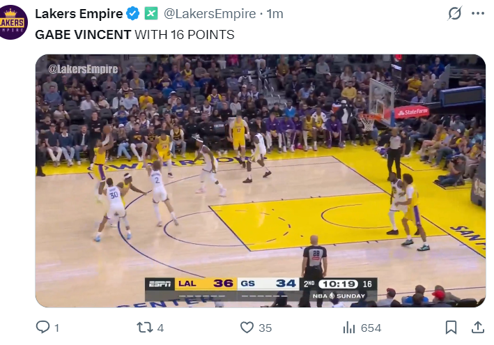 次节比赛,文森特延续火热手感,连续两个挡拆后直接三分出手命中,半场结束前11分19秒的上场时间内,7投4中(三分5中3),贡献16分4助攻2失误,得分效率冠绝全场。相比之下,库里上半场15分钟内7投5中(三分4中3)拿到14分,两人展开精彩对飙。湖人主帅雷迪克对文森特的使用仍显保守,未给予更多战术地位。