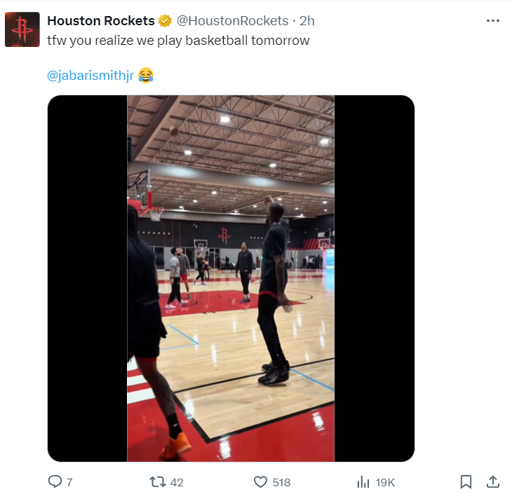 在季前赛的最后一天,火箭队的训练场上气氛十分欢乐。本-沙利文、亚当斯和小贾巴里-史密斯相谈甚欢,展现出球队内部的和谐氛围。据悉,小贾巴里-史密斯已经锁定了一个先发位置,与申京、阿门、KD一同组成先发阵容,而最后一个先发席位仍有待确定。
