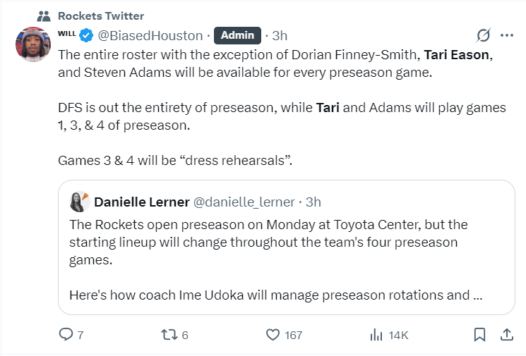 根据《休斯顿纪事报》记者Danielle Lerner与休媒Biased Houston的报道,除了DFS(芬尼-史密斯)、亚当斯和伊森外,其余球员将参与所有的季前赛比赛。芬尼-史密斯确定缺席所有季前赛,而伊森和亚当斯将参加部分场次,具体为第1、3、4场。