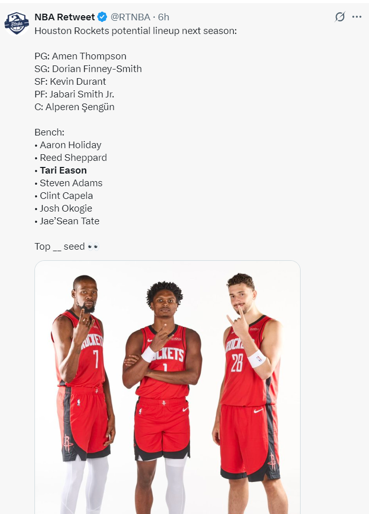 从美媒NBA Retweet预测火箭队的先发、轮换阵容来看,芬尼-史密斯很有可能会成为球队先发二号位。虽然他还没有获得登场许可,但只要DFS痊愈复出,那么他就会进入先发阵容。乌度卡教练会尝试让阿门打一号位,申京和杜兰特辅佐串联球队,乌度卡喜欢使用大阵容。