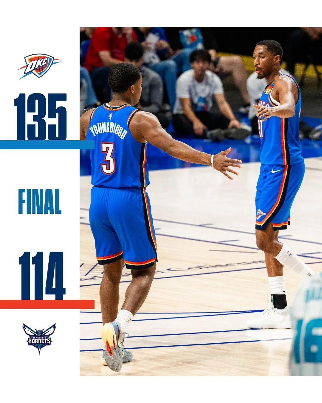 在NBA季前赛的一场焦点对决中,卫冕冠军雷霆以135-114的压倒性优势大胜黄蜂,展现了强大的团队实力。本场比赛,黄蜂队核心球员三球、布兰登·米勒、迈尔斯·布里奇斯悉数登场,而雷霆队则选择让亚历山大、杰威、霍姆格伦、多尔特、哈滕和卡鲁索等冠军首发及最佳第六人阵容休战。即便如此,雷霆依然将黄蜂摁在地上摩擦,全场未让对手领先过一次,半场便领先23分,最多时一度领先29分,如此表现令人惊叹。