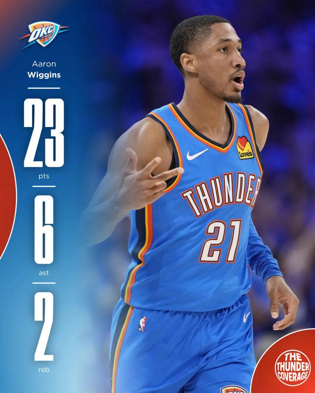 然而,在季后赛中,由于轮换阵容缩短、主力上场时间增加,威金斯的场均出战时间降低到了13.6分钟。但即便如此,他依然能够在有限的机会中展现出可圈可点的表现。首轮对阵灰熊的G1中,雷霆大胜51分,比赛早早进入垃圾时间,威金斯打了26分钟便得到全队最高的23分。次轮对阵掘金的比赛中,他也在多场比赛中贡献了稳定的数据。总决赛对阵步行者的比赛中,威金斯更是化身奇兵,多次在关键时刻挺身而出。