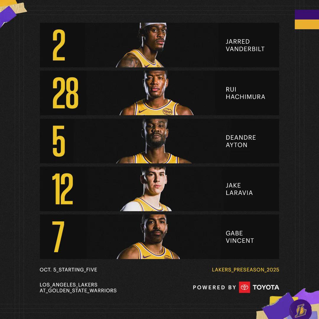 本场比赛,湖人方面有6名球员缺阵,包括东契奇、詹姆斯、里夫斯、斯玛特、蒂耶罗和克莱伯。而勇士的主力球员虽然可以出战,但教练科尔安排他们只打上半场比赛。湖人此役的首发阵容为:文森特、拉拉维亚、范德比尔特、八村塁和艾顿。勇士的首发则是:库里、波杰姆斯基、穆迪、巴特勒和追梦格林。值得一提的是,老将霍福德今日替补出战,不过据科尔透露,常规赛开始后,霍福德将打首发。