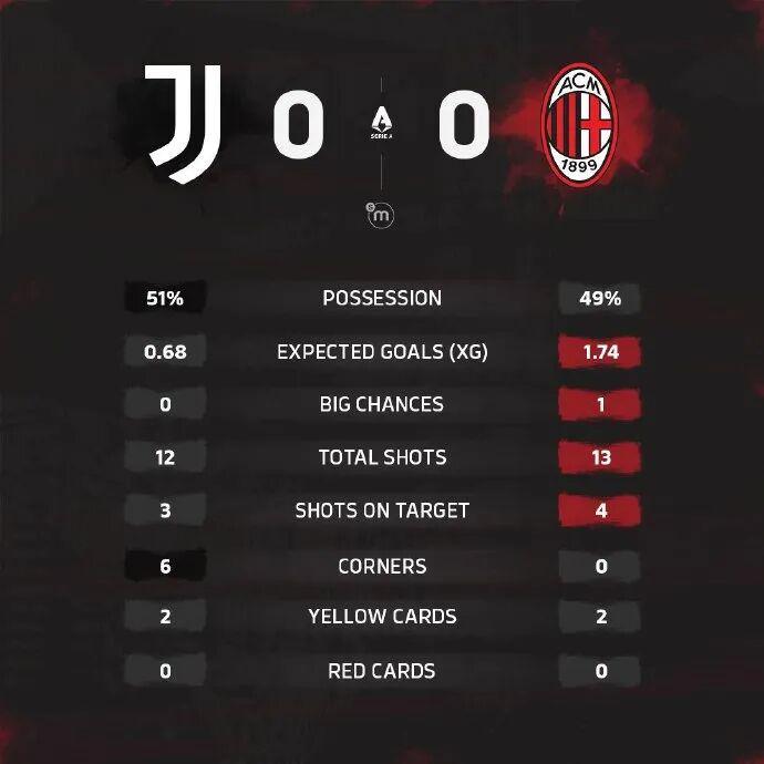 随后的比赛中,双方球员多次尝试远射和突破,但均未能取得进球。上半场伤停补时1分钟后,半场结束,尤文图斯与AC米兰暂时0-0战平。