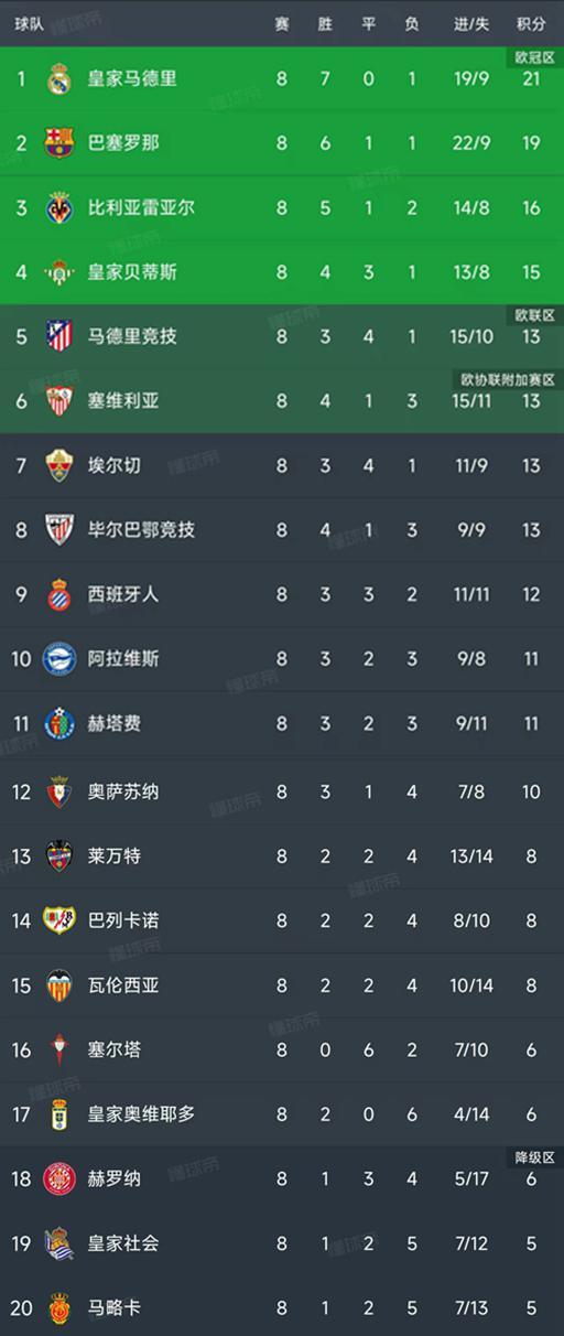 北京时间10月6日,西甲第8轮赛事迎来多场焦点对决。巴萨客场1-4惨败塞维利亚,西班牙人1-2不敌皇家贝蒂斯,皇家社会0-1负于巴列卡诺,塞尔塔1-1战平马竞。随着本轮比赛全部结束,最新积分榜出炉:皇马以21分重返榜首,巴萨跌至第二,皇家贝蒂斯升至第四。