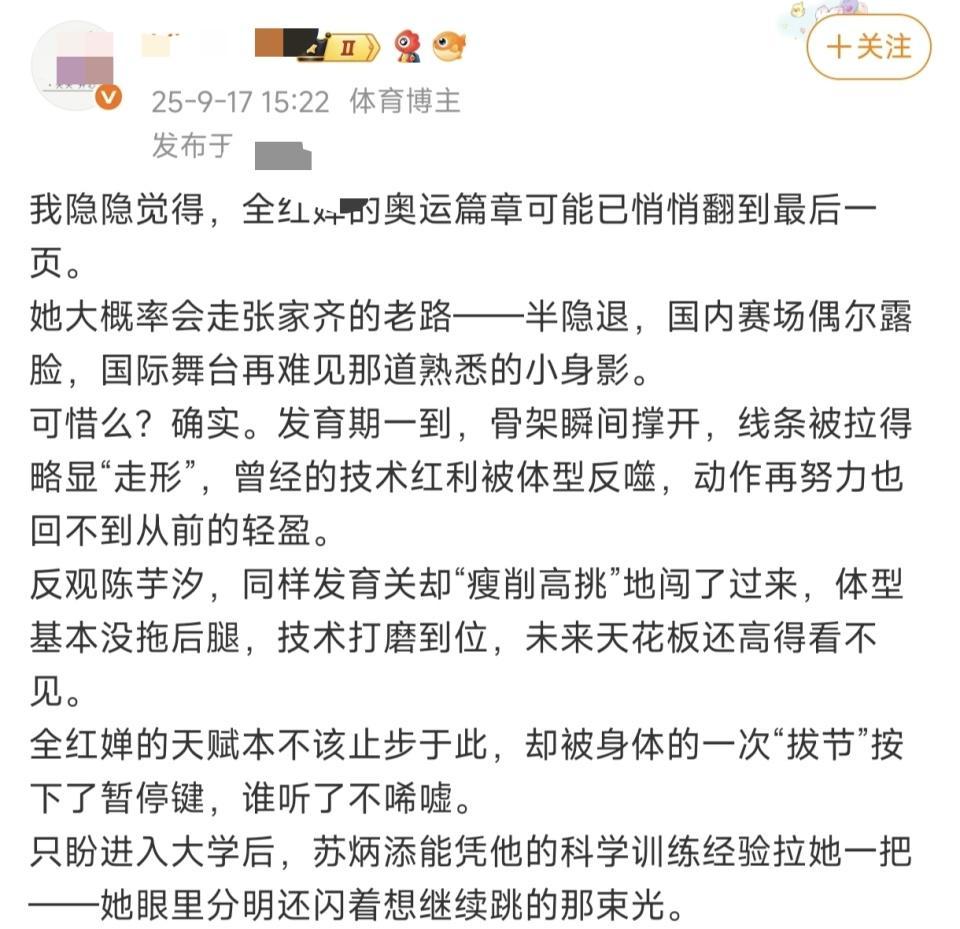 “全红婵的天赋本不该止步于此,却被身体的一次‘拔节’按下了暂停键。谁听了不唏嘘呢?只希望进入大学后,苏炳添能凭他的科学训练经验拉她一把——她眼里分明还闪着想继续跳的那束光。”这位博主的话语中,充满了对全红婵的惋惜和期待。