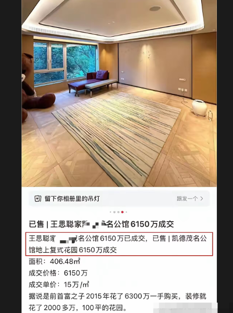 据悉,王思聪于2015年斥资6300万购入这套位于茂名公馆的豪宅,随后又投入2200万进行装修,总成本高达8500万。然而,在2023年首次挂牌时,他期望以1亿的价格出售,但市场反应冷淡,价格不断下调,期间甚至经历了流拍。最终,在今年9月,这套豪宅以6150万的价格成交,王思聪几乎将装修费全部赔了进去。相比之下,2022年同户型的房产曾以1.4亿的高价售出,王思聪此次交易无疑血本无归。