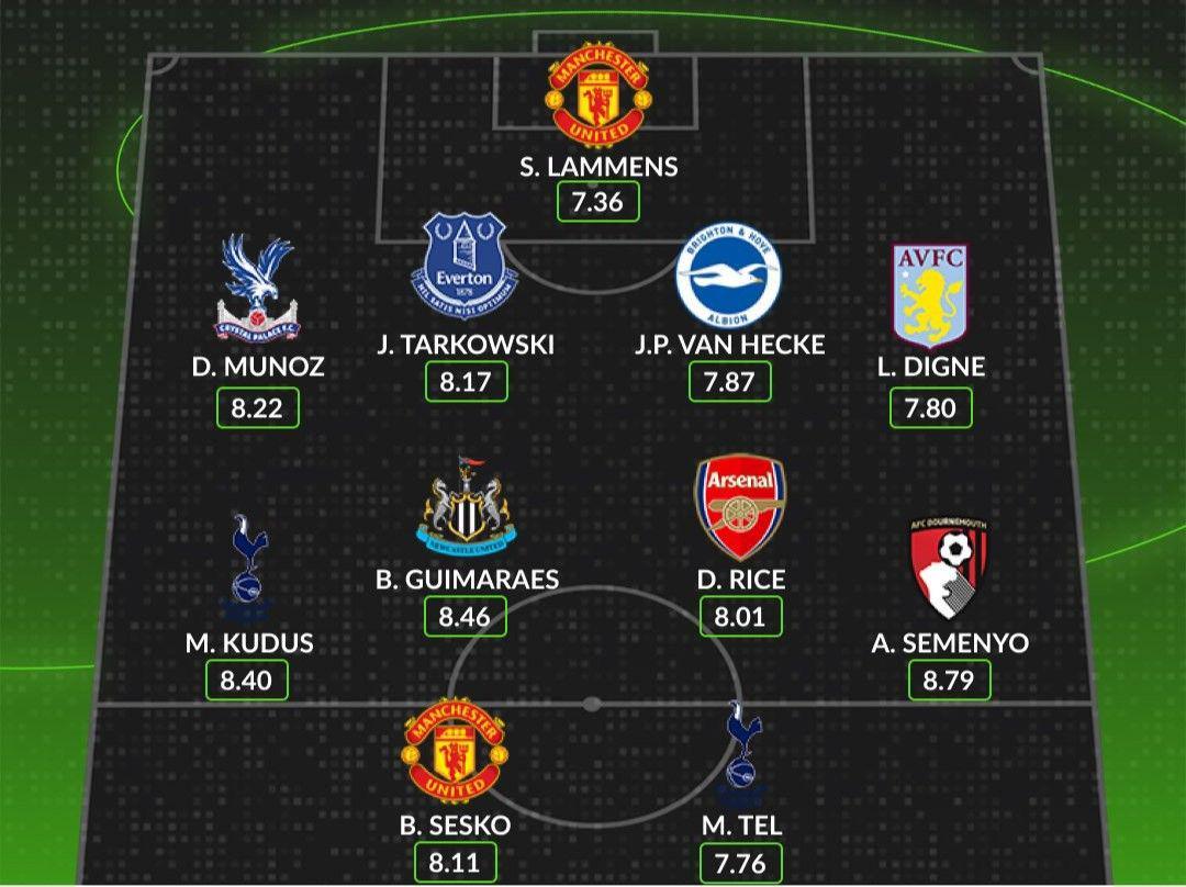 在本次最佳阵容的评选中,曼联和热刺两支球队各有两名球员脱颖而出,成功入选。这一结果无疑彰显了两队在本轮英超比赛中的出色发挥。