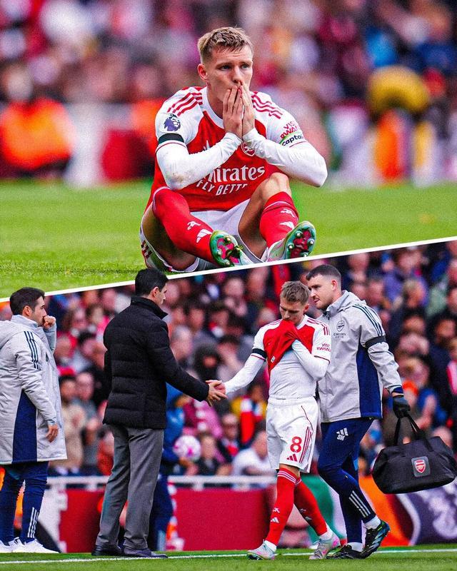 本赛季,厄德高已经成为了阿森纳伤病名单上的常客。仅仅4天前,他在欧冠对阵奥林匹亚科斯的比赛中首发登场,26岁的挪威人表现堪称现象级,The Athletic记者Dan Sheldon盛赞他“传球灵动、位置后移却掌控全局”。然而,到了周六的联赛,他却连续第三个英超主场半场伤退——此前对利兹联和诺丁汉森林的比赛,他都是因肩膀问题伤退,而这次则是膝盖受伤。
