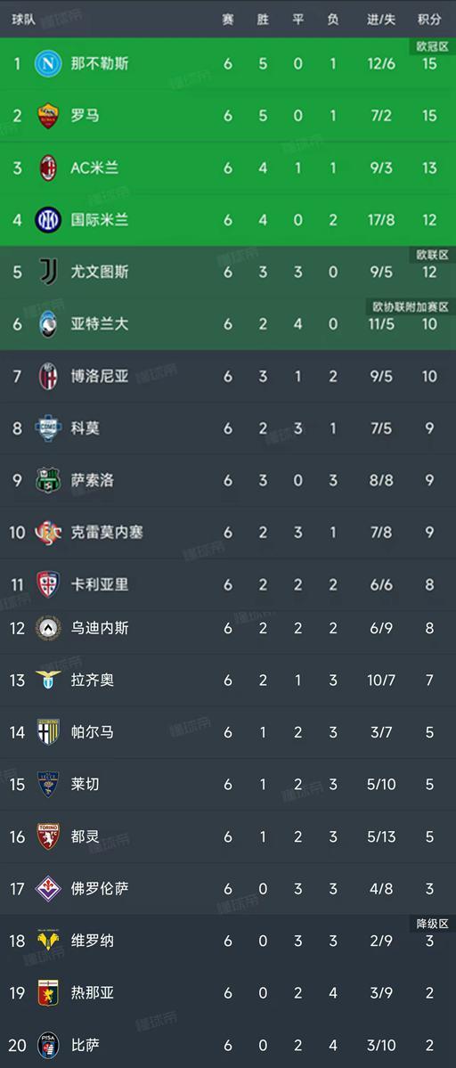 北京时间10月6日,意甲联赛第6轮赛事全面收官。卫冕冠军那不勒斯以2-1逆转热那亚,尤文图斯则与AC米兰0-0互交白卷,本轮过后积分榜格局发生显著变化。以下为详细战报及最新排名分析。