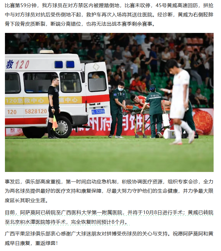 在这场备受瞩目的对决中,意外情况突然发生。广西平果足球俱乐部的一名球员在比赛中遭遇了对手的恶意犯规,导致颈部严重受伤。