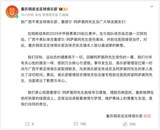 事件发生后,重庆铜梁龙足球俱乐部于6日凌晨通过官方微博发布声明,承认球员张志雄的犯规动作导致阿萨莫阿重伤,俱乐部管理层及张志雄本人已向广西平果队及球员家属致歉。当日赛后,重庆队代表专程赴医院探望,并承诺承担相应责任。