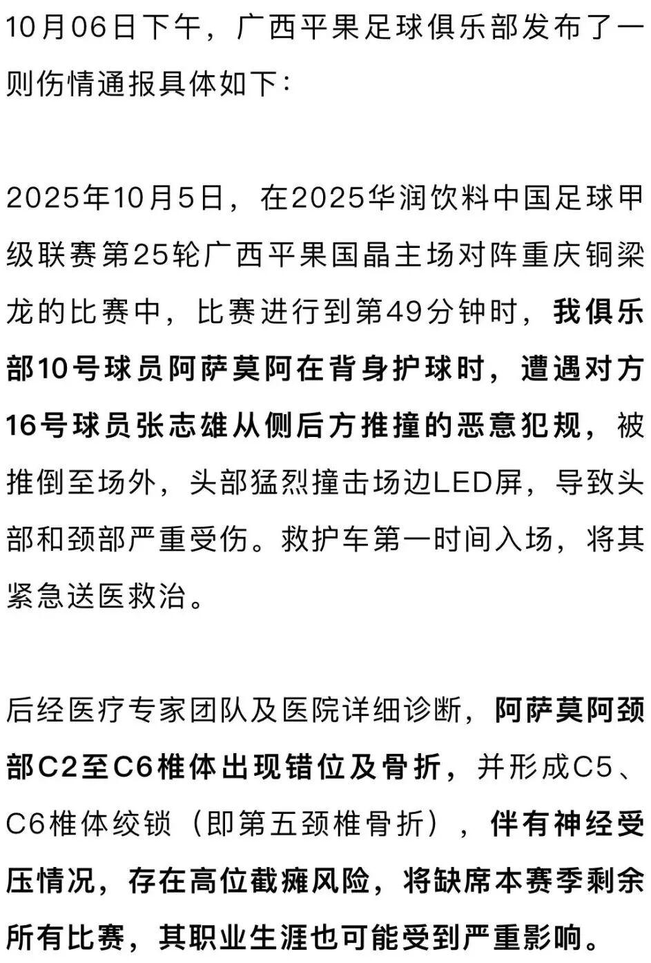 事件发生后,广西平果足球俱乐部迅速发布官方通报,对受伤球员表达了深切关怀,并承诺将全力配合医疗团队进行救治工作。俱乐部表示,将密切关注球员的伤情进展,及时向公众通报最新情况。