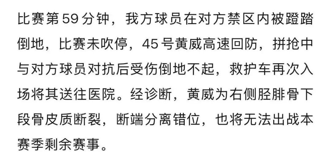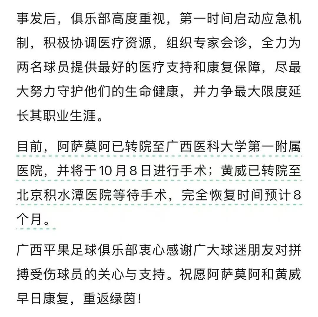 10月6日,广西平果足球俱乐部通过官方渠道发布伤情通报,确认:一名球员在比赛中遭受恶意犯规,经初步诊断存在高位截瘫风险;另一名球员因剧烈碰撞导致身体损伤,已被紧急送往医院接受治疗。俱乐部表示将持续关注伤员康复情况,并已启动相关维权程序。