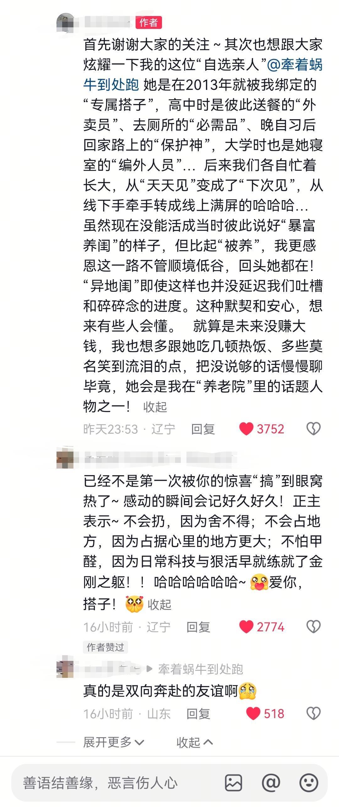 婚礼的主角“牵着蜗牛到处跑”也在评论区与制作囍字的女子进行了暖心互动。她表示:“已经不是第一次被你的惊喜搞到眼窝热了,感动的瞬间会记好久好久!这份心意满满的礼物,我不会扔,因为舍不得。”她还幽默地回应了关于雕塑材料甲醛的担忧:“也不怕雕塑材料有甲醛,因为日常科技与狠活早就练就了金刚之躯,爱你,搭子!”