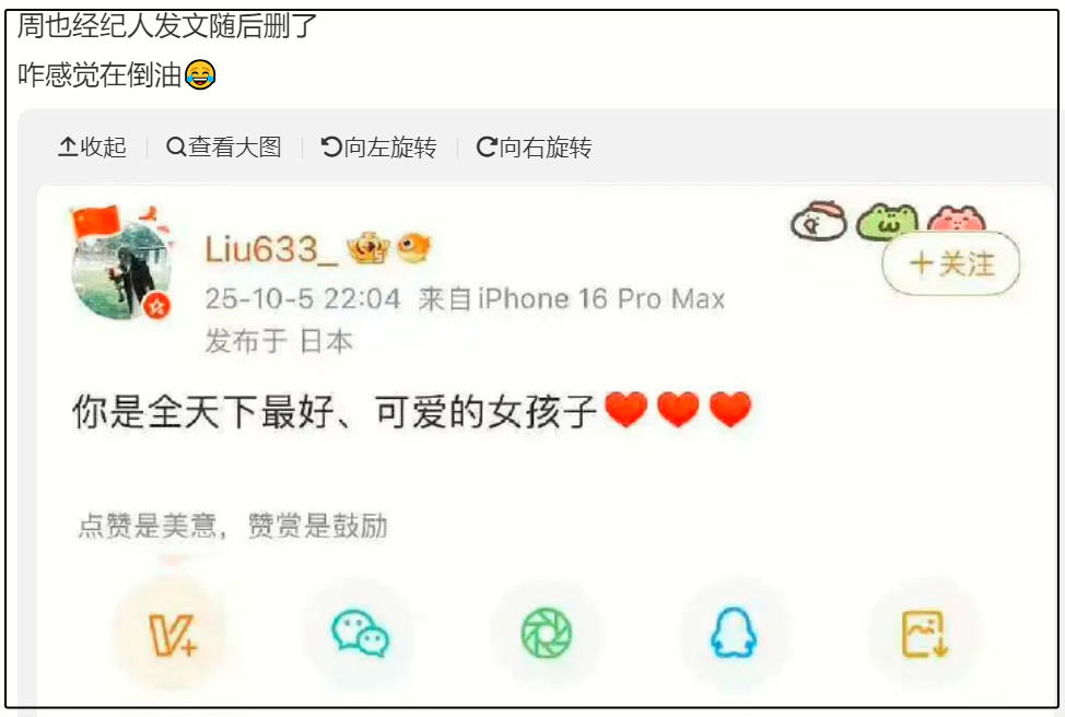周也经纪人刘姝姗曾发文力挺:“你是全天下最好、最可爱的女孩子”,但该动态随后被删除。此举引发粉丝强烈不满,认为刘姝姗存在“倒油”嫌疑。长期以来,粉丝对刘姝姗在资源分配、项目选择(如《行止晚》)及危机公关等方面的表现颇有微词,甚至多次在微博公开喊话。