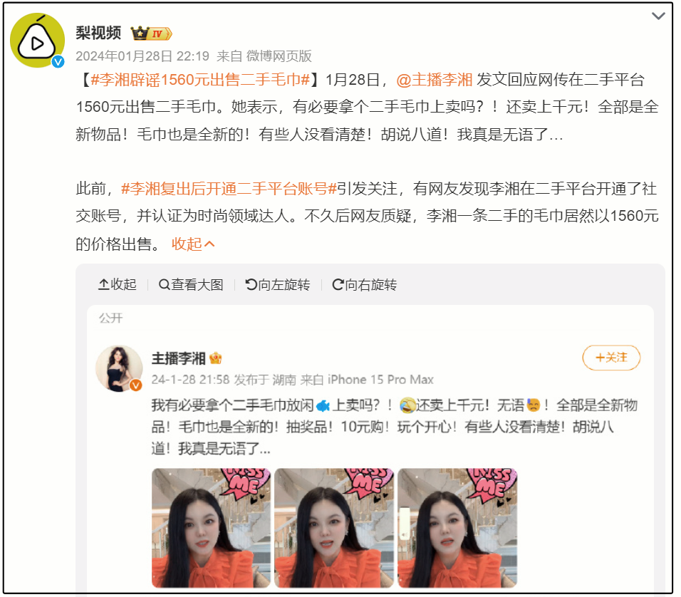 事实上,李湘淡圈后已多次卷入争议。2024年1月,她宣布将家中闲置物品挂至某二手平台作为“新年礼物”回馈粉丝,但1560元的花色毛巾引发网友斥责,认为其看不起网友。尽管李湘否认出售二手毛巾,强调是全新抽奖品,但争议已难以平息。