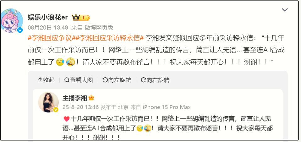 此后,李湘又被质疑与释永信有关,在其他女明星都发文澄清后,她的回应却迟到了一个多月。此次live图风波不仅触怒李冰冰阵营,更暴露出其团队危机应对的不足。从二手物品争议到释永信关联疑云,李湘的口碑与人脉均受到损害,如今又陷入资源圈博弈,未来走向令人关注。