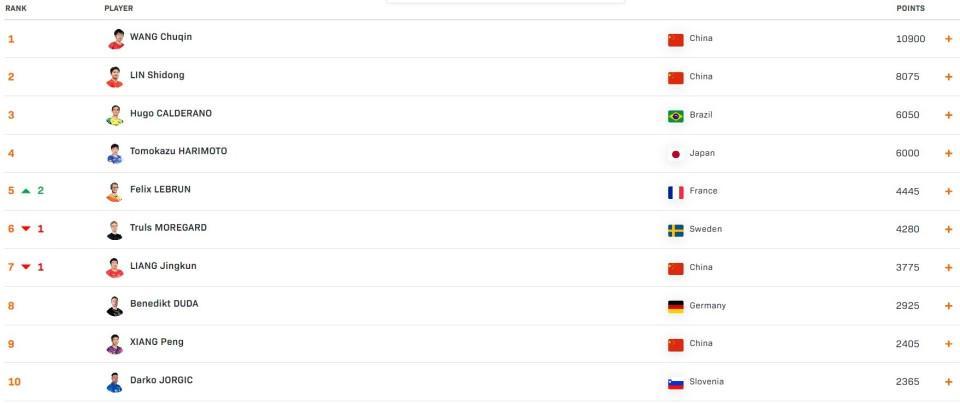 男双:法国勒布伦兄弟居首,王楚钦/林诗栋升至第四