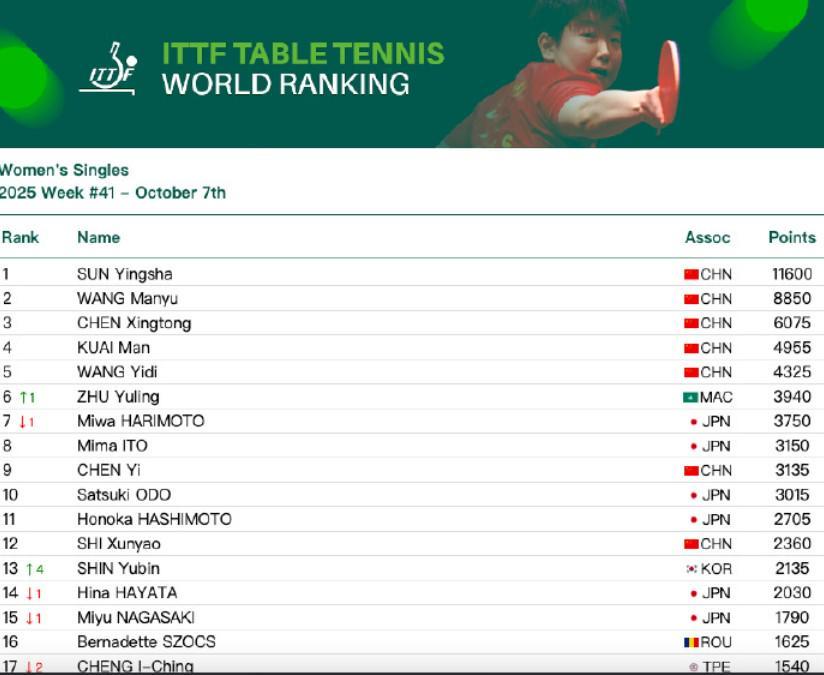 北京时间10月7日,国际乒联正式公布了第41周的世界排名。在这份备受瞩目的榜单中,代表中国澳门参赛的朱雨玲凭借出色表现,成功反超日本选手张本美和,成为外协排名最高的运动员,目前位列世界第6。