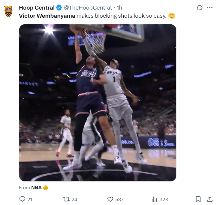 由于马刺队内索汉、福克斯、卡斯尔等多位主力球员未出战,文班亚马成为了球队唯一的亮点。首节比赛,他就以一记精彩的大帽封盖了卡明斯基的上篮,尽管卡明斯基已经过了文班亚马一个身位,但后者依然凭借出色的弹跳和反应速度完成了封盖。首节战罢,文班亚马2投2中,贡献6分8篮板3助攻1盖帽,尽管有5次失误,但他的表现依然令人瞩目。