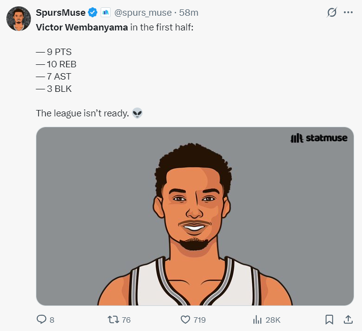 上半场结束,文班亚马在短短16分23秒的出场时间内,3投3中,三分1中1,罚球2中2,高效砍下9分10篮板7助攻3盖帽,尽管有6次失误,但他的命中率达到了惊人的100%,三分命中率同样为100%,正负值高达+20,成为球队取胜的关键。