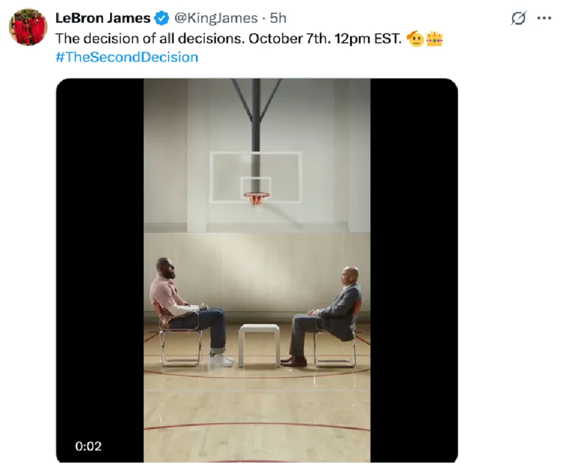 细心的网友发现,视频结尾处赫然显示着“决定二”三个大字,而詹姆斯在镜头中身穿的条纹衬衫,竟与2010年他通过电视直播宣布“决定一”时的着装如出一辙。这一细节瞬间点燃了舆论场,无数球迷开始猜测:这位即将年满40岁的传奇球星,究竟要宣布什么重大决定?
