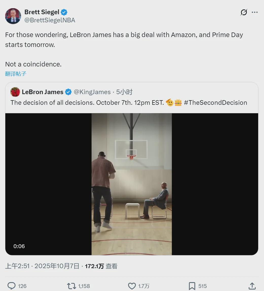 关于"决定二"的猜测呈现两极分化。ClutchPoints记者布雷特·西格尔指出:"詹姆斯已与亚马逊签下大额合约,而Prime会员日恰在明天开始,这绝非偶然。"但多数媒体仍倾向于退役说——湖人随队记者丹尼尔·斯塔坎德分析:"从时机看,现在宣布退役很合理,这能让他像科比那样在每座球馆接受告别致敬。"