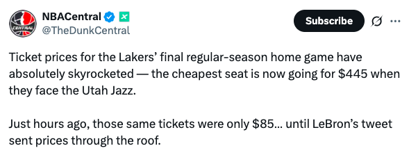 票务市场数据显示,在詹姆斯发布这条神秘推文后,湖人队常规赛收官战(4月13日对阵犹他爵士)的门票价格出现戏剧性飙升。据TickPick等主流票务平台统计,原本最低85美元的看台票,在短短数小时内暴涨至445美元,涨幅超过423%。这一价格波动幅度创下本赛季湖人主场票价涨幅纪录。