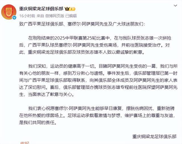 在中甲联赛第25轮比赛中,在与该队球员张志雄一次拼抢后,广西平果队球员塞缪尔·阿萨莫阿先生受伤离场,并前往医院接受治疗。对此,重庆铜梁龙足球俱乐部及球员张志雄本人致以最诚挚的歉意。