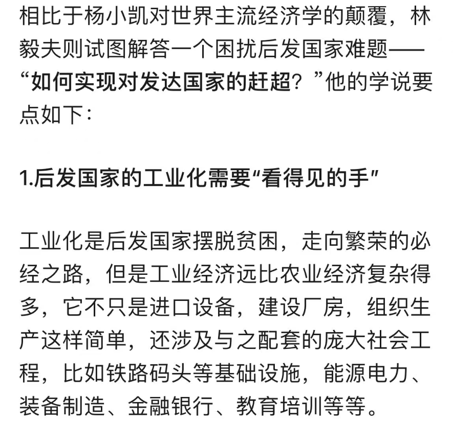 杨小凯的核心观点在于,后发国家在追赶过程中可能陷入制度性陷阱,而林毅夫则强调通过政策引导实现经济快速崛起。