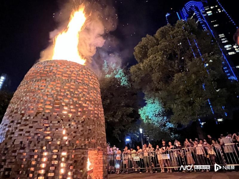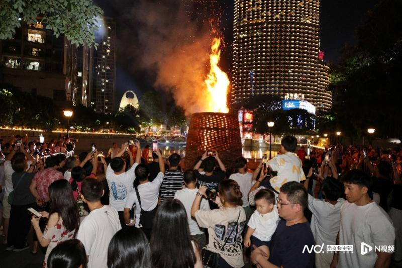 20:30,随着村民们一轮轮添加木糠,番塔终于熊熊燃起。火苗迅速攀升,直冲十几米高,引得现场上千名围观市民一阵阵欢呼。火光、城市景观灯色以及猎德村旁商业区高楼大厦的玻璃幕墙交相辉映,构成了一幅现代与传统交织的美丽画卷。