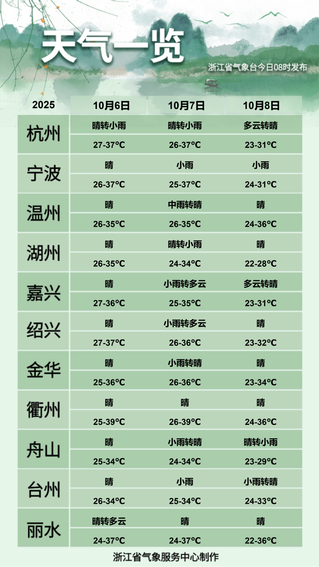 不过,此次冷空气实力较弱,降温持续时间有限。预计10日起浙江气温将再度回升,11日至12日大范围高温将卷土重来,多地最高气温可能重回36-38℃。