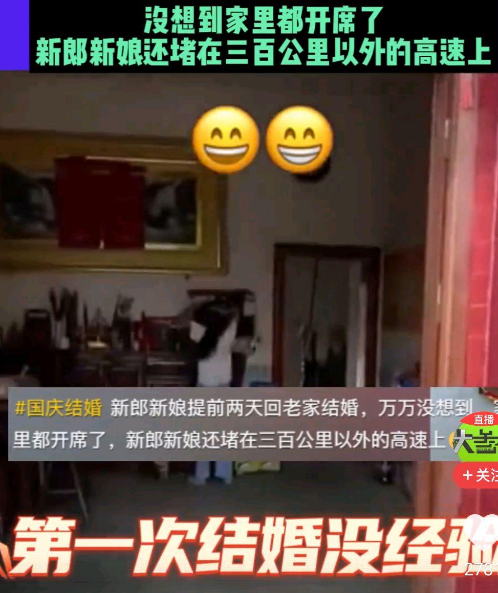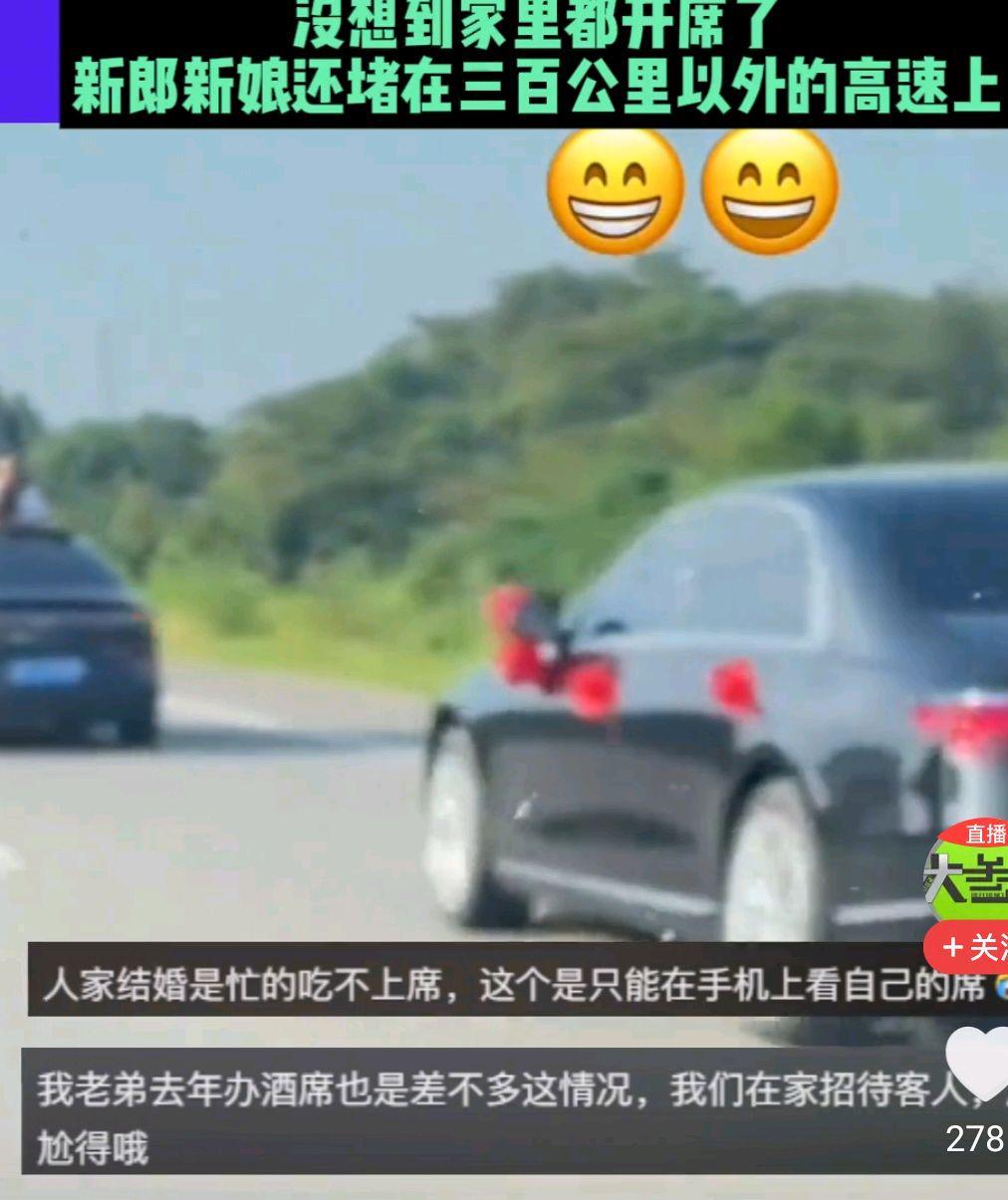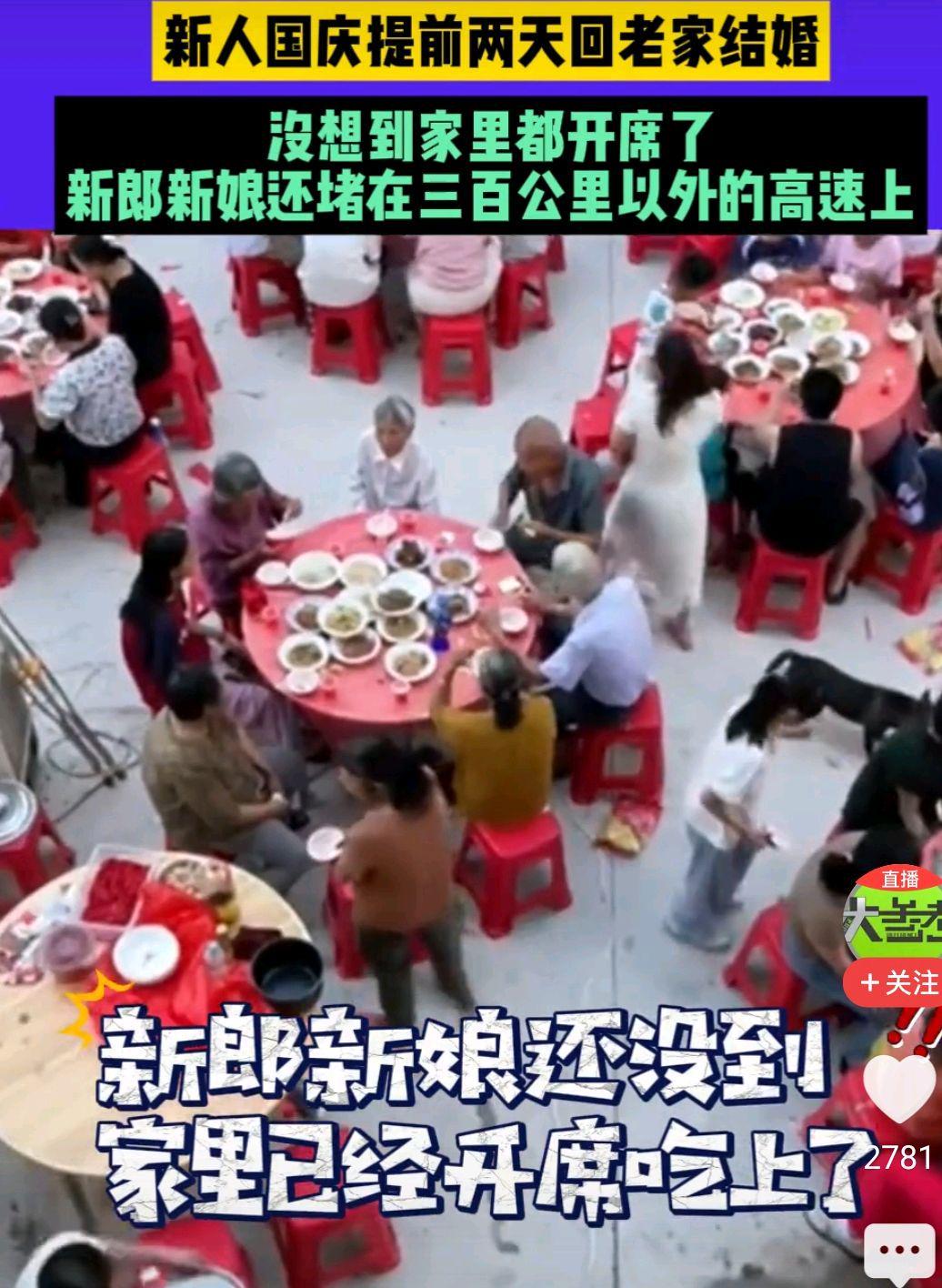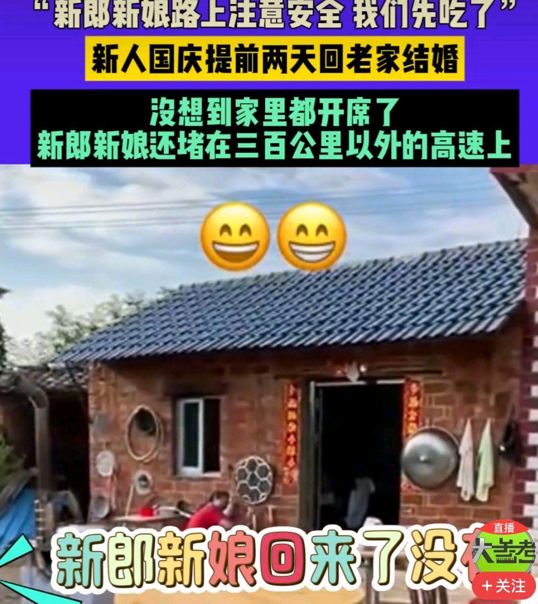 择日不如撞日,既然人都来了,喜酒也准备好了,那就今天办吧!于是,就出现了这样一幕:家里小院子已经开席了,可新郎新娘还堵在300公里外的高速上,真是让人哭笑不得。