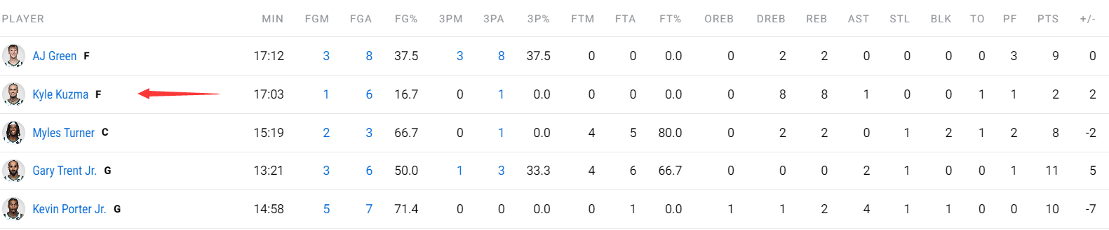 本场比赛,最引人注目的莫过于凯尔-库兹马的低迷表现。这位雄鹿的先发大前锋,全场出战17分钟,6次出手仅命中1球,三分球更是1中0,仅得到2分8篮板1助攻,还出现了1次失误,命中率低至16.7%。更令人咋舌的是,他在篮下4次出手仅命中1球,甚至出现了一次上篮过桥的尴尬场面,库兹马的状态实在令人堪忧。
