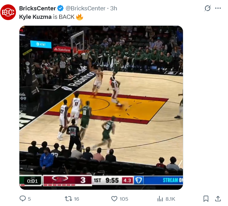 比赛首节,库兹马虽然命中第一个球,但随后便开始了疯狂的打铁之旅。他面对威金斯后仰中投,竟然直接来了一个三不沾,让雄鹿替补席都目瞪口呆,现场也响起了嘘声。
