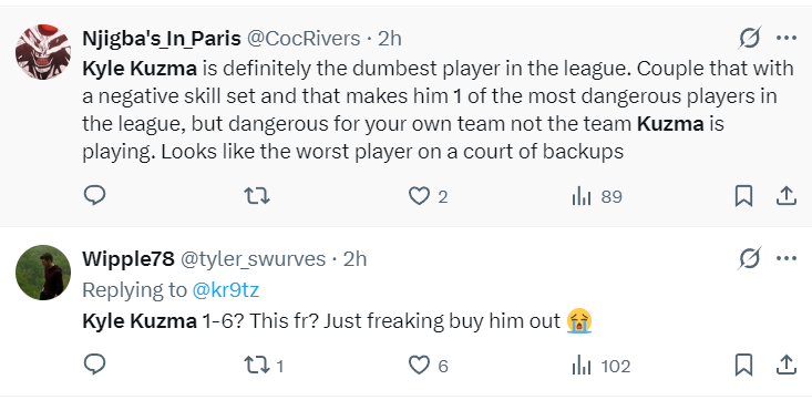 库兹马的糟糕表现也引来了美国球迷的强烈不满。有球迷直言:“库兹马绝对是联盟最愚蠢的球员,加上他糟糕的表现,他成为了联盟最具威胁的球员之一,不过这种威胁是针对自己的球队。”还有球迷表示:“库兹马6中1?这简直太离谱了,我们干脆买断他吧。”